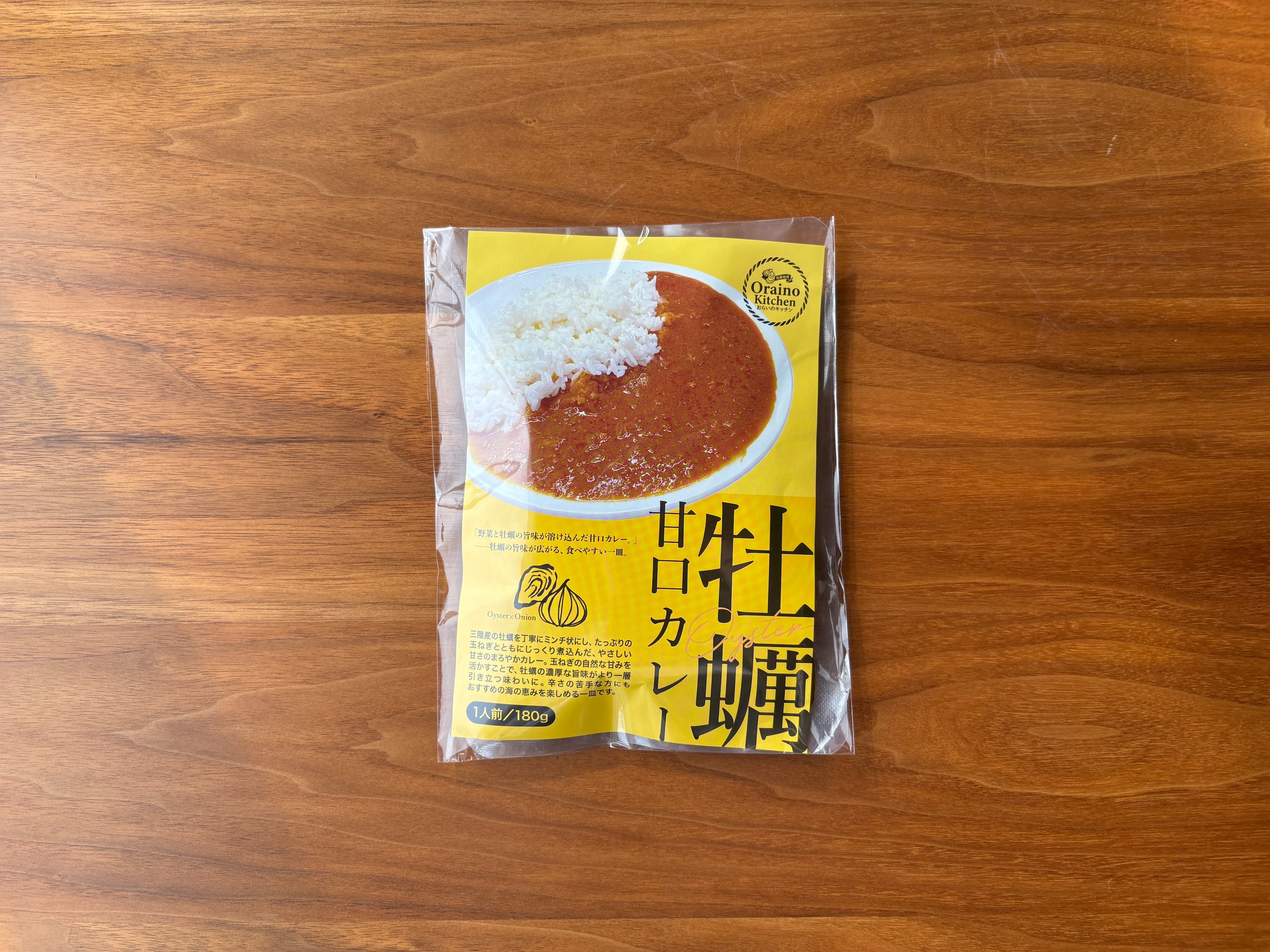原材料 : たまねぎ、牡蠣(宮城県)、大豆油、カレールウ(小麦粉、牛脂、砂糖、カレー粉、デキストリン、食塩、その他)、にんにく、生姜、コリアンダーパウダー、ターメリックパウダー、パプリカパウダー、ホイップクリーム、(植物油脂、乳製品)、食塩/シリコーン、ケイ素、調味料(アミノ酸等)、カラメル色素、酸味料(DL-リンゴ酸、フィチン酸、クエン酸、乳酸)、